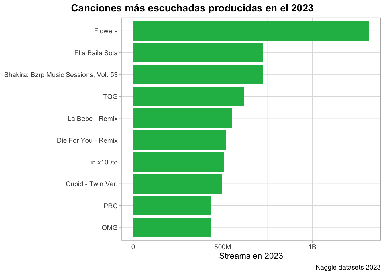 En este gráfico podemos observar, cuáles fueron las canciones más escuchadas del 2023 que fueron lanzadas ese mismo año. Dentro de estas, destaca la canción “Flowers” de Miley Cyrus con más de 1 billón de reproducciones. Se puede ver que en el podio se encuentran canciones latinas como “Ella Baila Sola” de Bad Bunny, “Bzrp Music Sessions 53” con Shakira, TQG de Shakira y Karol G, entre otras. Esto nos muestra el impacto que puede tener la corriente latina en la música a nivel mundial.
