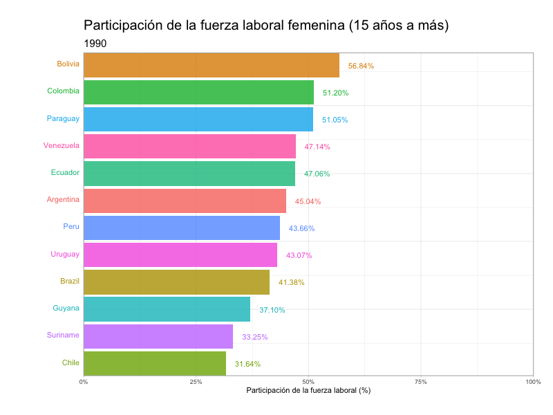 En este post exploraré la participación laboral de hombres y mujeres en América del Sur entre 1990 a 2021. Para esto, he utilizado la base de datos “Labour Force Participation Rate” del Programa de las Naciones unidas para el Desarrollo (PNUD) la cual puedes encontrar aquí. Esta base de datos considera la fuerza laboral desde los 15 años en adelante.